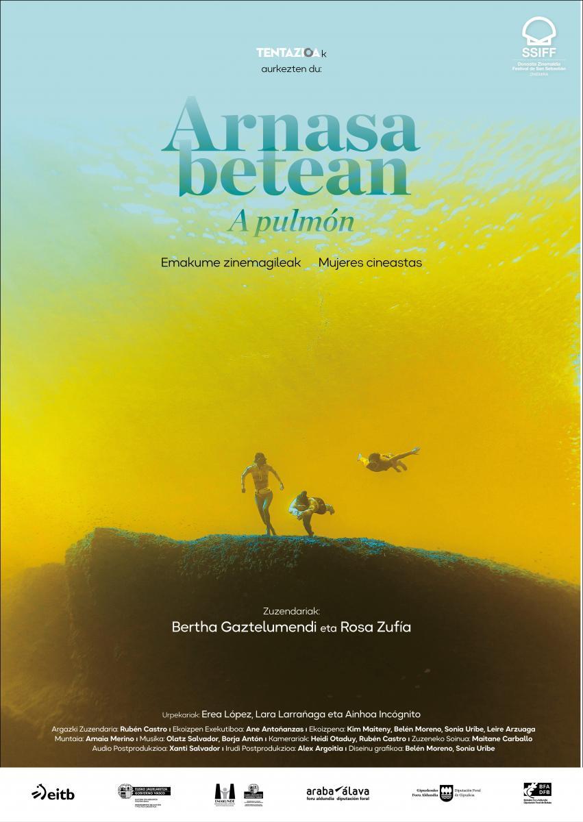 Título original: Arnasa betean, emakume zinegileak. Dirección: Bertha Gaztelumendi, Rosa Zufía. País: España. Año: 2023. Duración: 75 minutos. Género: Documental. Documental sobre cine. Submarinismo. Buceo. Reparto: Documental, Erea López, Lara Larrañaga, Ainhoa Incógnito. Guion: Bertha Gaztelumendi, Rosa Zufía. Música: Olatz Salvador, Borja Antón. Fotografía: Ruben Crespo. Productora: Tentazioa. Estreno en España: 22 de marzo de 2024. Sinopsis: Cineastas vascas del pasado y del presente son las protagonistas en una inmersión profunda en el cine hecho por mujeres. Tres buceadoras nos guían en un viaje submarino a través de las historias del cine dirigido por mujeres, haciendo hincapié en la temática de sus películas, sus personajes, su mirada, sus sueños, sus esfuerzos por salir adelante y su aportación a nivel social. Un redescubrimiento de las pioneras, así como vistazo sorprendente a los trabajos tanto de cineastas jóvenes como veteranas que triunfan en festivales de cine. Arnasa betean: A pulmón fue rodada entre septiembre y diciembre de 2022 en diferentes localizaciones del País Vasco, además de Madrid y Menorca.