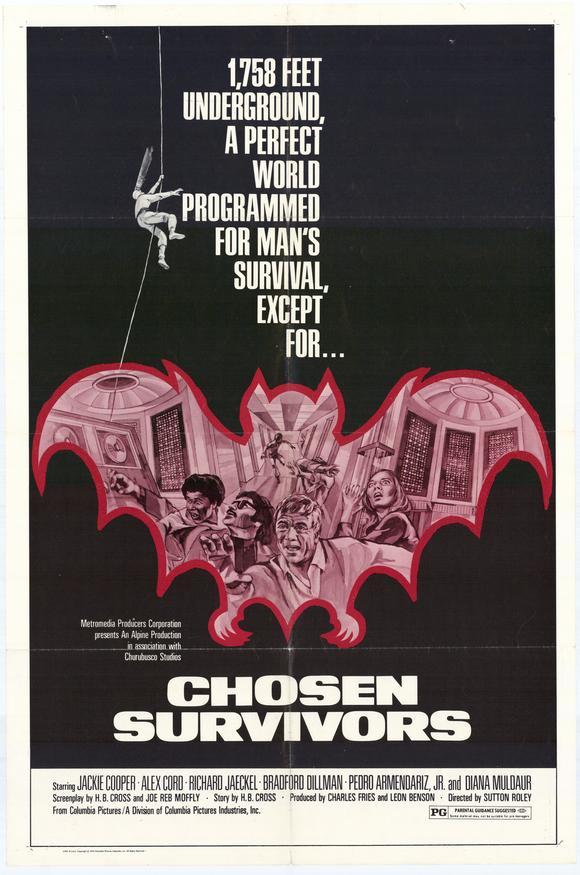 Los sobrevivientes elegidos (Chosen Survivors, 1974). México. Dirección: Sutton Roley. Interpretación: Jackie Cooper, Alex Cord, Richard Jaeckel, Bradford Dillman, Pedro Armendáriz Jr., Diana Muldaur, Lincoln Kilpatrick, Gwenn Mitchell, Barbara Babcock, Cristina Moreno, Nancy Rodman, Kelly Lange. Guión: Harry Spalding, Joe Reb Moffly (Argumento: Harry Spalding). Música: Fred Karlin. Fotografía: Gabriel Torres. Productora: Co-producción Mexico-USA; Metromedia Producers Corporation (MPC)/Alpine Productions Inc./Estudios Churubusco Azteca S.A. Acción. Aventuras. Drama. Terror. Ciencia ficción. Futuro postapocalíptico. Vampiros. Color: Technicolor. Duración: 93 minutos. Un grupo de hombres y mujeres que han destacado en el ejercicio de sus diversas profesiones, son raptados y conducidos en helicópteros hasta lo que parece ser un refugio situado en el desierto. A través de una pantalla una mujer les explica que ellos han sido elegidos por el gobierno de los Estados Unidos para que sobrevivan a la guerra termonuclear que acaba de desatarse.